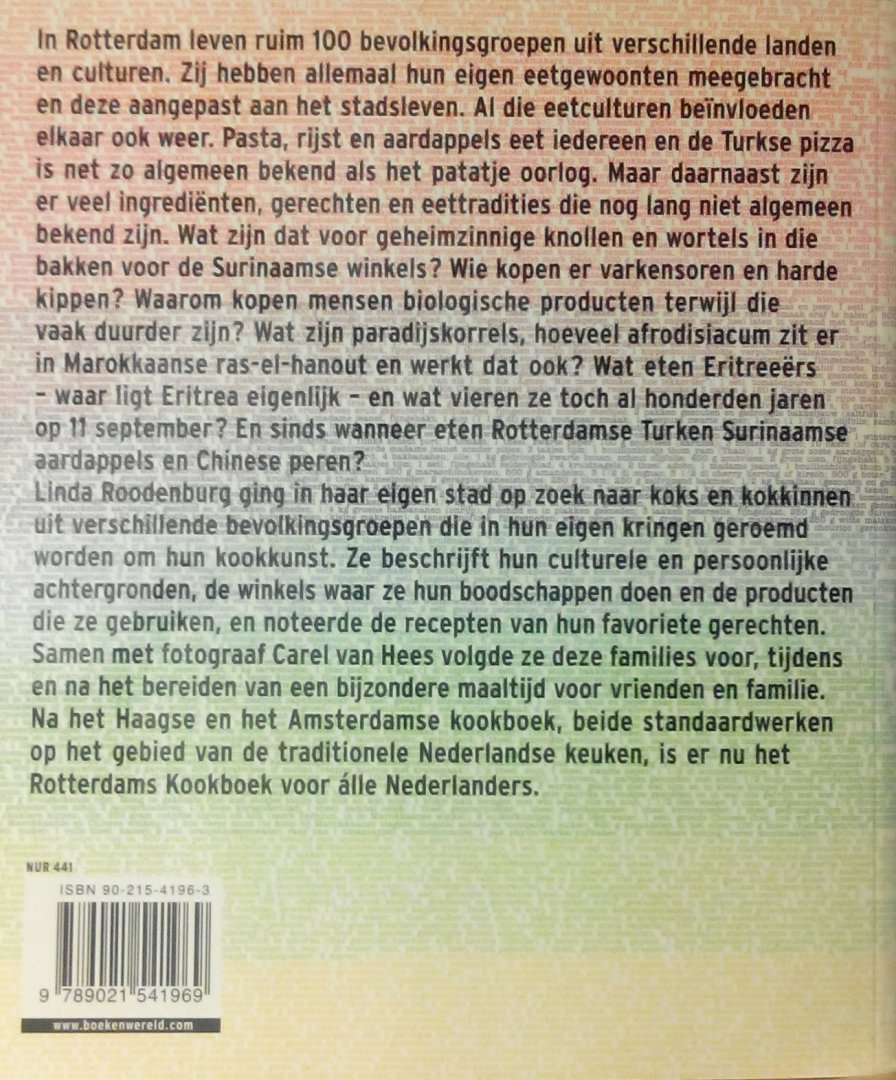 Maar er zijn ook ingredienten en gerechten die niet algemeen bekend zijn.Wat zijn dat voor knollen in de bakken voor de Surinaamse toko? Wie eten er varkensoren en harde kippen? Wat zijn paradijskorrels, hoeveel afrodisiacum zit er in ras-al-hanout en werkt dat ook? Wat eten Eritreers - waar ligt Eritrea eigenlijk - en wat vieren ze al honderden jaren op 11 september? En sinds wanneer eten Rotterdamse Turken Surinaamse aardappels en Chinese peren? Linda Roodenburg ging op zoek naar koks en kokkinnen en families uit 13 verschillende culturen. Ze beschrijft hun achtergronden en verhalen, de winkels waar ze boodschappen doen en hun favoriete gerechten. Samen met fotograaf Carel van Hees volgde ze alle 13 voor, tijdens en na een bijzondere maaltijd voor vrienden en familie. Na het Haagse en Amsterdamse kookboek, beide standaardwerken over de traditionele Nederlandse keuken, is er nu het Rotterdams Kookboek voor ALLE Nederlanders . |