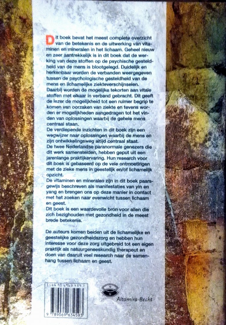 - werking van deze stoffen op de psychische gesteldheid van de mens is blootgelegd. Duidelijk en herkenbaar worden de verbanden weergegeven tussen de psychologische gesteldheid van de mens en lichamelijke ziekteverschijnselen. Daarbij worden de mogelijke tekorten aan vitale stoffen met elkaar in verband gebracht. Dit geeft de lezer de mogelijkheid tot een ruimer begrip te komen van oorzaken van ziekte en tevens worden er mogelijkheden aangedragen tot het vinden van oplossingen waarbij de gehele mens centraal staan. De verdiepende inzichten in dit boek zijn een wegwijzer naar oplossingen waarbij de mens en zijn ontwikkelingsweg altijd centraal staat. De twee Nederlandse paranormale genezers die dit werk samenstelden, hebben geput uit een jarenlange praktijkervaring. Hun research voor dit boek is gebaseerd op de vele ontmoetingen met de zieke mens in geestelijk en/of lichamelijk opzicht. De vitaminen en mineralen zijn in dit boek paarsgewijs beschreven als manifestaties van yin en yang en brengen ons op deze manier in contact met het zoeken naar evenwicht tussen lichaam en geest. Dit boek is een waardevolle bron voor allen die zich bezighouden niet gezondheid in de meest brede betekenis. De auteurs komen beiden uit de lichamelijke en geestelijke gezondheidszorg en hebben hun interesse voor deze zorg uitgebreid tot een eigen praktijk als natuurgeneeskundig therapeut en doen van daaruit veel research naar de samenhang tussen lichaam en geest.