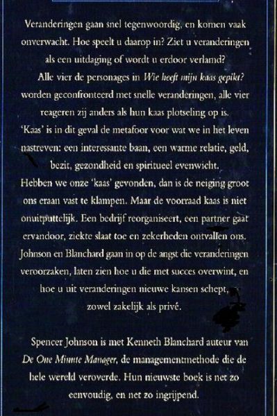 ![Johnson , Spencer . & Kenneth Blanchard . [ ISBN 9789025413873 ] - Wie Heeft Mijn Kaas Gepikt ? ( Omgaan met veranderingen zakelijk en privé . ) Veranderingen gaan snel tegenwoordig, en komen vaak onverwacht. Hoe speelt u daarop in? Ziet u veranderingen als een uitdaging of wordt u erdoor verlamd? - Johnson , Spencer . & Kenneth Blanchard . [ ISBN 9789025413873 ] - Wie Heeft Mijn Kaas Gepikt ? ( Omgaan met veranderingen zakelijk en privé . ) Veranderingen gaan snel tegenwoordig, en komen vaak onverwacht. Hoe speelt u daarop in? Ziet u veranderingen als een uitdaging of wordt u erdoor verlamd? -](https://images.boekwinkeltjes.nl/medium/yOacPlzvEL5n4IsR6QDr.jpg)