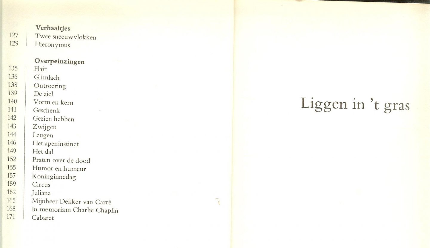 | Titel: | Liggen in 't gras .. Op zijn eigen, oorspronkelijke en begrijpelijke wijze speelt Toon Hermans met de taal om zijn visie op de wereld en het wereldje, op het geloof, de natuur en de mens, op leven en dood te geven. Geloof, hoop, liefde en humor zijn |
