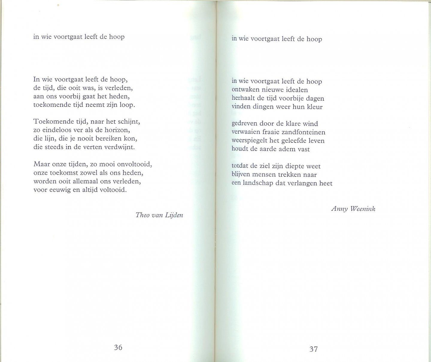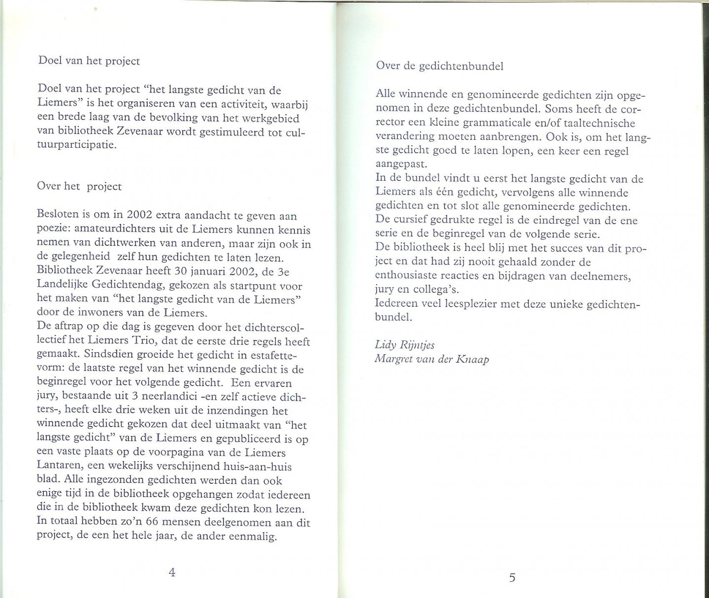 Op 30 januari 2002 heeft het Liemers Trio het startsein gegeven met de volgende drie dichtregels waarmee de eerste serie gedichten moest beginnen Lang leve de liefde en zo Was er meer te wensen Toen wij aan onze reis begonnen |