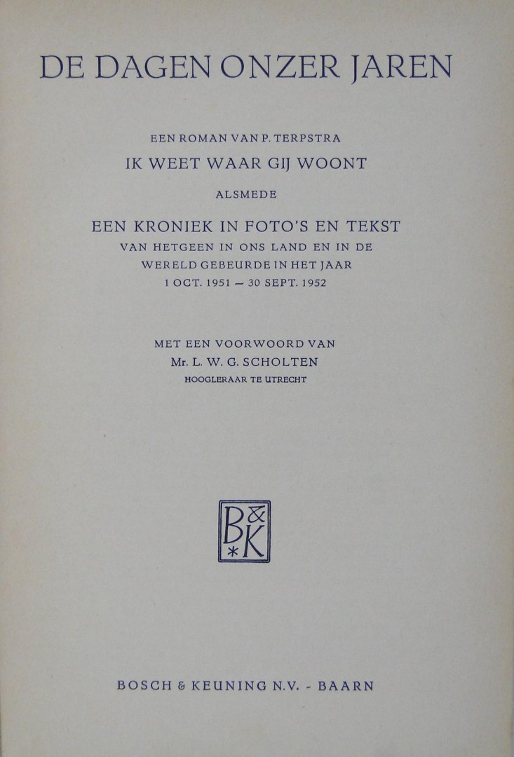 | Titel: | De dagen onzer jaren : Ik weet waar gij woont : een roman van P. Terpstra, alsmede een kroniek in foto`s en tekst van hetgeen in ons land en in de wereld gebeurde in het jaar 1 oct. 1951 - 30 sept. 1952 |