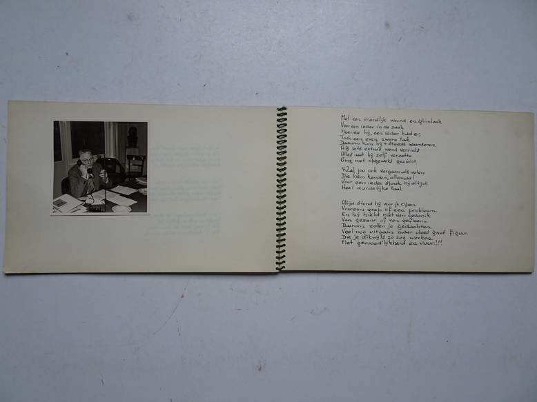 | Bijzonderheden: | 1959; ringband; 11 blz. poëzie n.a.v. een afscheid na 10 jaar dienst bij de Landbouwersbank te Almelo; met 8 originele, ingeplakte zwart wit foto's, van o.a. het pakhuis a/d Oude Kloosterweg; handgeschreven tekst, in inkt; oblong, 24,5x15 cm. |