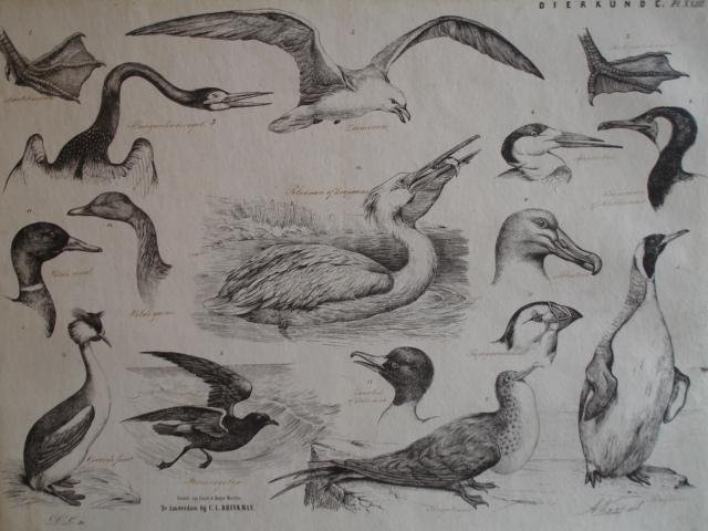 | Meer info: | Afgebeeld zijn o.a.: Zeemeeuw, Pelikaan, Stormvogel, Fuut, Fregatvogel, Papegaaiduiker. De namen van de vogels zij er in fraai handschrift bijgeschreven. |