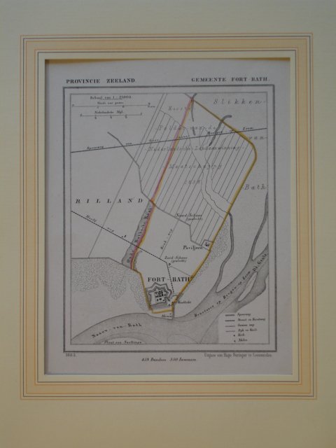 | Uitgever: | Kaart van de gemeente Fort-Bath. Litho 1865. J. Kuyper.Gemeente Atlas van de provincie Zeeland. Uitgave Suringar Leeuwarden. Schaal van 1:25.000. Met handgekleurde gemeente-grens. Afmeting: ca.15x20 cm. Geleverd in passe-partout. |