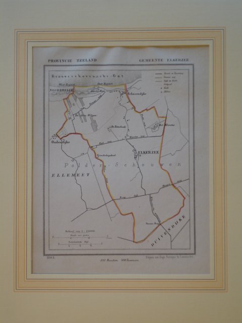| Uitgever: | Kaart van de gemeente Elkerzee. Litho 1865. J. Kuyper.Gemeente Atlas van de provincie Zeeland. Uitgave Suringar Leeuwarden. Schaal van 1:25.000. Met handgekleurde gemeente-grens. Afmeting: ca.15x20 cm. Geleverd in passe-partout. |