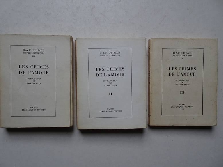 | Bijzonderheden: | 1961; J.-J. Pauvert; Oeuvres complètes, III-V; introd. by G. Lély; 1 ill. in each vol; soft paper covers; 12,5x16,5 cm. |