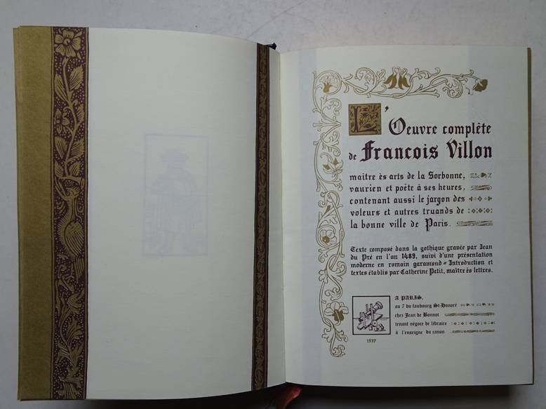 | Titel: | Oeuvre complète de Francois Villon, maitre ès arts de la Sorbonne, vaurien et poète à ses heures, contenant aussi le jargon des voleurs et autres truands de la bonne ville de Paris. Texte composé dans la gothique gravée par Jean du Pré en l... |