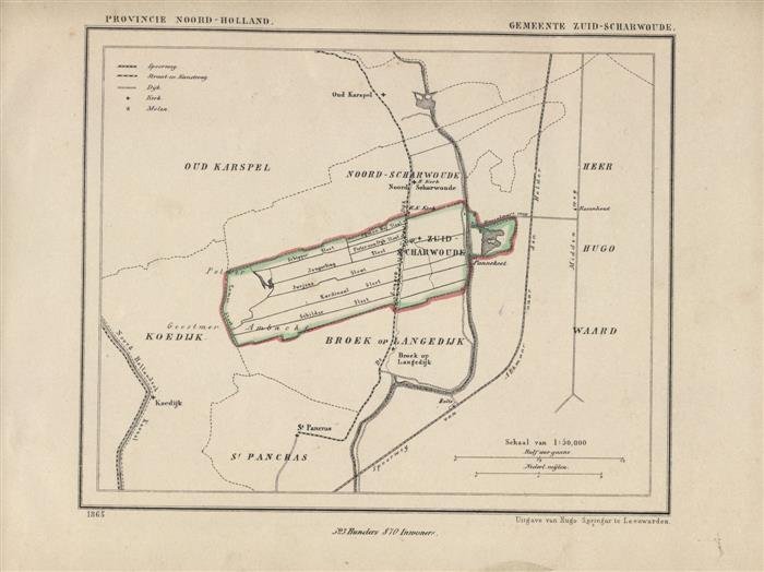 Voor kwaliteit zie de afbeelding.Map Kuyper Gemeente atlas van Noord Holland This is an original map taken from an incomplete copy of the Gemeente Atlas van Noord-Holland by Jacob Kuyper ( 1821 – 1908). Issued in 1868 by Surringa Leeuwarden. All maps were printed in black. The outline border of the Municipality were coloured by hand. De Gemeente Atlas van Nederland verscheen ca. 1868 en werd uitgegeven door Hugo Suringar te Leeuwarden. Voor iedere provincie een deel. Het bevat de kaarten van alle Nederlandse gemeenten. De kaarten werden in zwart/wit gedrukt waarbij de gemeentegrenzen met de hand waren ingekleurd. De tekenaar van de kaarten, Jacob Kuyper (1821-1908) was een belangrijke pionier op het gebied van de thematische kartografie en medeoprichter van het Koninklijk Nederlands Aardrijkskundig Genootschap (KNAG). Hij stelde in de periode 1857-1880 verschillende atlassen samen. De bekendste atlas was de Gemeente-Atlas van Nederland. De kaarten voor deze atlas tekende Kuyper in de jaren 1865-1870