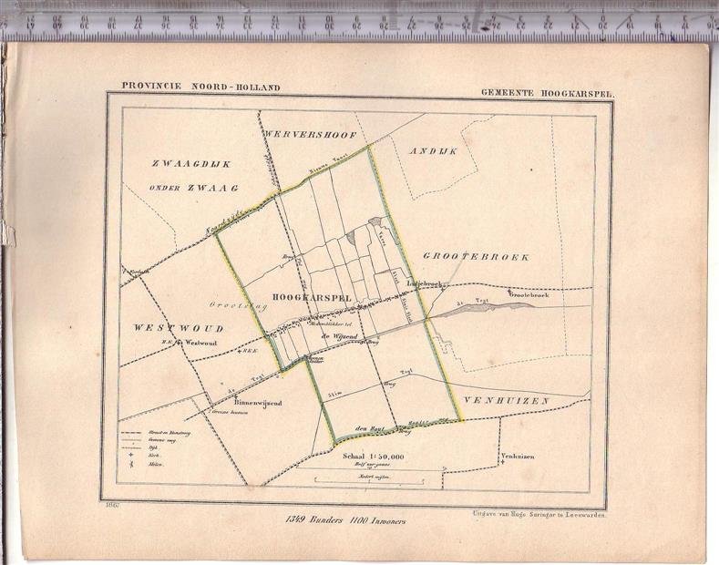 Voor kwaliteit zie de afbeelding.Map Kuyper Gemeente atlas van Noord Holland This is an original map taken from an incomplete copy of the Gemeente Atlas van Noord-Holland by Jacob Kuyper ( 1821 – 1908). Issued in 1868 by Surringa Leeuwarden. All maps were printed in black. The outline border of the Municipality were coloured by hand. De Gemeente Atlas van Nederland verscheen ca. 1868 en werd uitgegeven door Hugo Suringar te Leeuwarden. Voor iedere provincie een deel. Het bevat de kaarten van alle Nederlandse gemeenten. De kaarten werden in zwart/wit gedrukt waarbij de gemeentegrenzen met de hand waren ingekleurd. De tekenaar van de kaarten, Jacob Kuyper (1821-1908) was een belangrijke pionier op het gebied van de thematische kartografie en medeoprichter van het Koninklijk Nederlands Aardrijkskundig Genootschap (KNAG). Hij stelde in de periode 1857-1880 verschillende atlassen samen. De bekendste atlas was de Gemeente-Atlas van Nederland. De kaarten voor deze atlas tekende Kuyper in de jaren 1865-1870