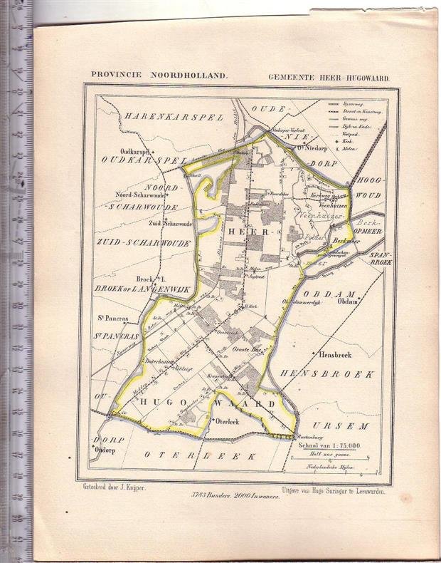 Voor kwaliteit zie de afbeelding.Map Kuyper Gemeente atlas van Noord Holland This is an original map taken from an incomplete copy of the Gemeente Atlas van Noord-Holland by Jacob Kuyper ( 1821 – 1908). Issued in 1868 by Surringa Leeuwarden. All maps were printed in black. The outline border of the Municipality were coloured by hand. De Gemeente Atlas van Nederland verscheen ca. 1868 en werd uitgegeven door Hugo Suringar te Leeuwarden. Voor iedere provincie een deel. Het bevat de kaarten van alle Nederlandse gemeenten. De kaarten werden in zwart/wit gedrukt waarbij de gemeentegrenzen met de hand waren ingekleurd. De tekenaar van de kaarten, Jacob Kuyper (1821-1908) was een belangrijke pionier op het gebied van de thematische kartografie en medeoprichter van het Koninklijk Nederlands Aardrijkskundig Genootschap (KNAG). Hij stelde in de periode 1857-1880 verschillende atlassen samen. De bekendste atlas was de Gemeente-Atlas van Nederland. De kaarten voor deze atlas tekende Kuyper in de jaren 1865-1870