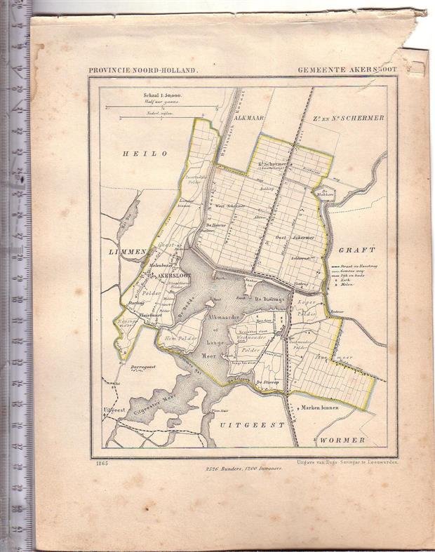 Voor kwaliteit zie de afbeelding. SCHEURTJE in de rechterbovenhoek Net tot in de prent. ( door de gemeente naam heen bij de s en l. Aan achterzijde versterkt.Map Kuyper Gemeente atlas van Noord Holland This is an original map taken from an incomplete copy of the Gemeente Atlas van Noord-Holland by Jacob Kuyper ( 1821 – 1908). Issued in 1868 by Surringa Leeuwarden. All maps were printed in black. The outline border of the Municipality were coloured by hand. De Gemeente Atlas van Nederland verscheen ca. 1868 en werd uitgegeven door Hugo Suringar te Leeuwarden. Voor iedere provincie een deel. Het bevat de kaarten van alle Nederlandse gemeenten. De kaarten werden in zwart/wit gedrukt waarbij de gemeentegrenzen met de hand waren ingekleurd. De tekenaar van de kaarten, Jacob Kuyper (1821-1908) was een belangrijke pionier op het gebied van de thematische kartografie en medeoprichter van het Koninklijk Nederlands Aardrijkskundig Genootschap (KNAG). Hij stelde in de periode 1857-1880 verschillende atlassen samen. De bekendste atlas was de Gemeente-Atlas van Nederland. De kaarten voor deze atlas tekende Kuyper in de jaren 1865-1870