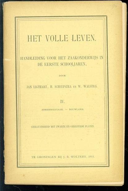 | Bijzonderheden: | 1911, Zie beschrijving, Jan Ligthart, H. Scheepstra en W. Walstra -, IV: Zomerhalfjaar - Bouwland.20 cm., Ingenaaid., Geïllustreerd mat zwarte en gekleurde platen . o.a door C. Jetses., 136 Pagina's + 16 pagina's fondsreclame van de firma Wolters. |