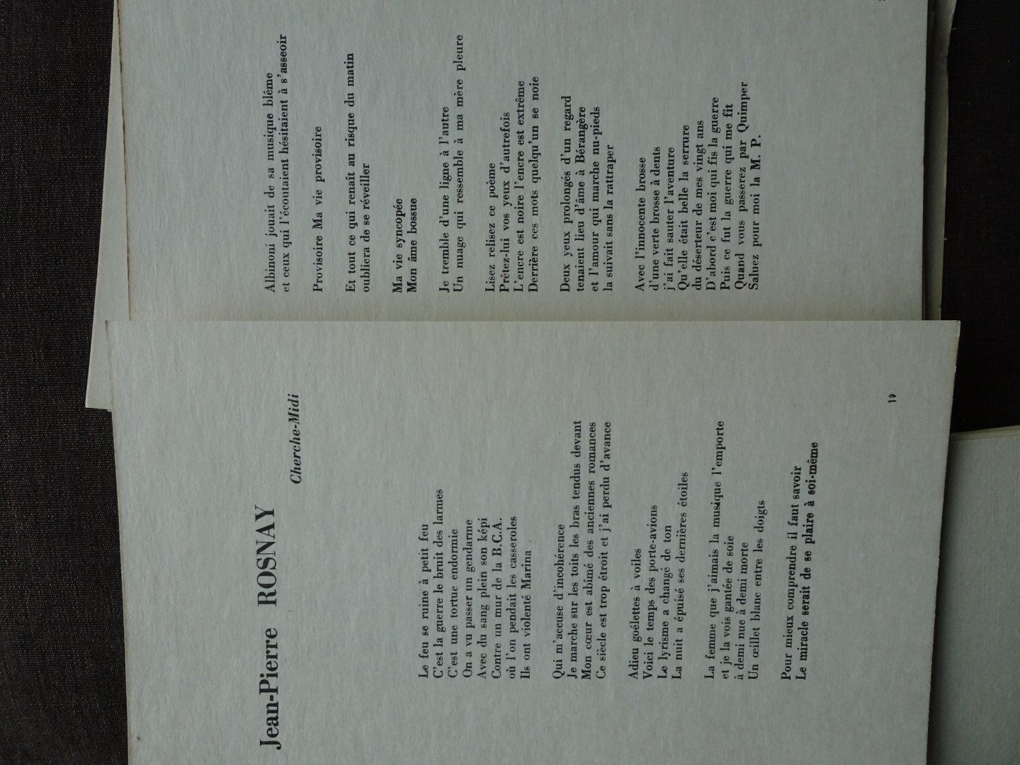 First Edition. A collection of 30 cards 1-4 Title and Introduction, 5-29 Poems, 30 "Table Des Matieres" Undated but 2 of the poems are dated 1962, Yves de la Croix & Table Des Matieres & Georges Zwobada Notre-Dame so we assume this is dated 1960's. INCLUDES 29 cards contained in a card folder. CONTENTS : Introduction; Le Temps Nouveau by Yves De La Croix; Esther by Jean-Michel Deysson; les Trois Visages d"une Bohemienne by Sandra Jayat; Untitled by Lionel Mirisch; Le Fil d"Ariane by Marc Pietry; Blasphemes, vous futes by Roger Pomaredes; Cherche-Midi by Jean-Pierre Rosnay; Stellaire memoire by Pierre Salvi; La Memoire des Chevaux by Bruno Schlemmer; Untitled by Daniel Thibaut; Notre-Dame & Mon amour au sixieme & Au dela de cette limite... by Georges Zwobada.