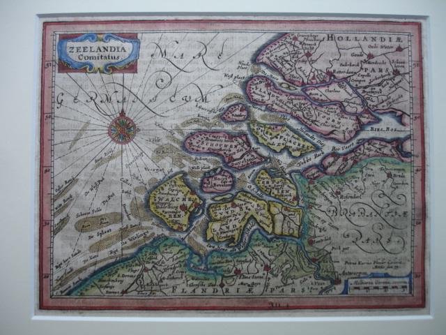 | Bijzonderheden: | zijn naam is op het kaartje vermeld met de leeftijd van 75 jaar. Handgekleurd. Afmeting: 21 x 16 cm. Keerzijde Duitse tekst. Afkomstig uit de Duitstalige editie van de Atlas Minor. Blonk: kaart 38.Geleverd in zuurvrij passe-partout. |