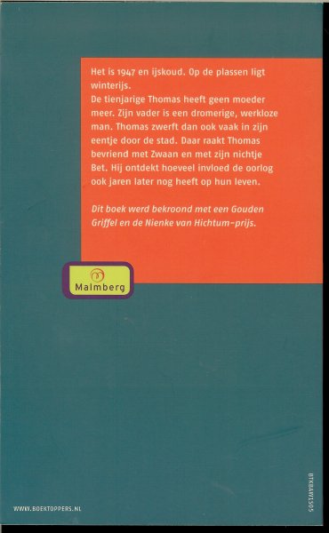 Thomas raakt bevriend met Zwaan, een stille jongen die net zo oud is als hij. Zwaan heeft een streng nichtje van dertien jaar. Thomas wordt prompt verliefd op haar. Bij Zwaan thuis leert hij de besloten wereld kennen van mensen die door de oorlog zijn getroffen. Winterijs is bekroond met de Gouden Griffel, de Nienke van Hichtumprijs en de Woutertje Pieterse Prijs. ‘Schokkend is de onwetendheid van Nederlandse kinderen, vlak na de oorlog, over wat er met de joden gebeurd is. En razend knap is het van de auteur om die vergeten tijd van zwijgen en verbijten met zoveel lichtvoetigheid en fijne humor op te roepen in een onvergetelijke jeugdroman.’ Juryrapport Woutertje Pieterse Prijs 2002 |