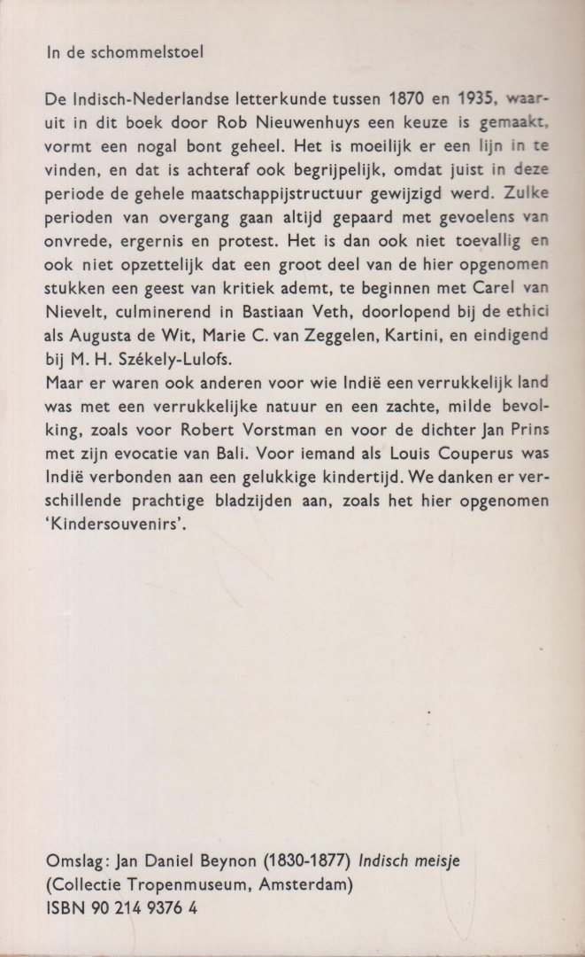 | Titel: | In de schommelstoel - Een keuze uit de Indisch - Nederlandse letterkunde van 1870 tot 1935. Carel van Nieveld FC Wilsen Maurits Robert Voerstman Bastiaan Veth Otto Knaap Creusesol Kartini Louis Couperus Augusta de Wit MH Szekely - Lulofs |