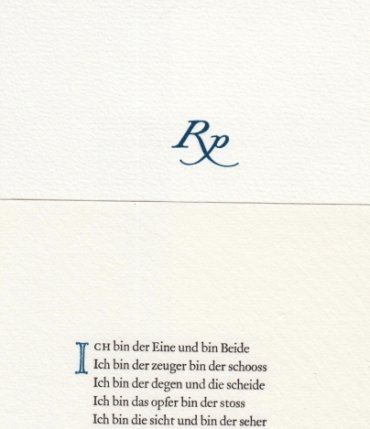 | Meer info: | (Amsterdam, Regulierenpers, 1986). Vouwblad in omslag. Met de hand gezet uit de Van Dijck en gedrukt in blauw en zwart op Japans papier in een oplage van 87 exemplaren. Lapidair gedicht in prachtuitvoering. Duitstalig. Jaarwisselingsgeschenk 1986/1987. De Regulieren 23/1986. |