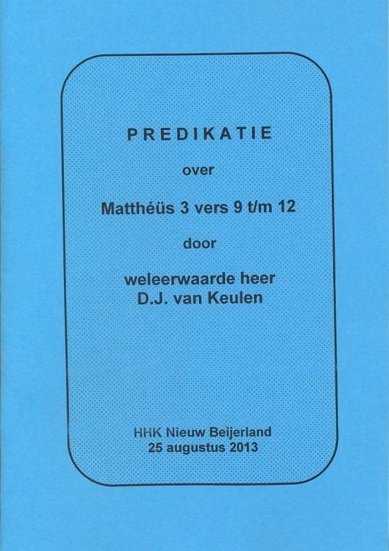 Predikatie van dhr. D.J. van Keulen over Mattheus 3 vers 9 t/m 12 (Johannes de Doper). Gehouden in de Hersteld Hervormde Kerk te Nieuw-Beijerland op 25 augustus 2013. 24 blz. |