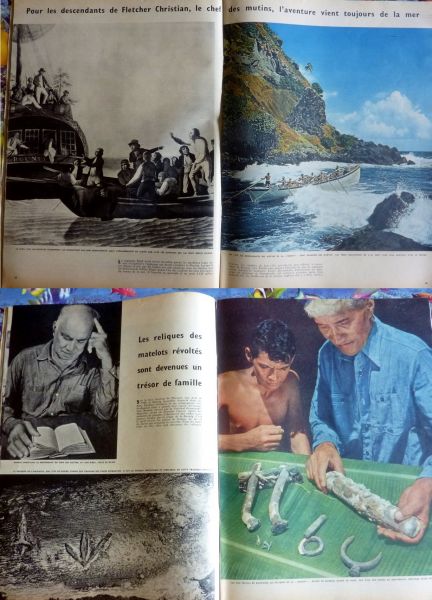 Leuk fris nummer van Paris Match juni 1958. Naast uitgebreide fotoreportages van De Gaulle o.a. in een verrassend modern ogend Algerije, is de eye-catcher van dit nummer gewijd aan PITCAIRN. We zien IRVING JOHNSON duiken. Het anker van de Bounty in ongeschonden staat (ook de foto nadat die aan land is gebracht), en ook een interview met nazaten van Fletcher Christian zoals Parkin Christian, worden niet vergeten. Het artikel van Marc Heimer beslaat maar liefst 12 pagina's.