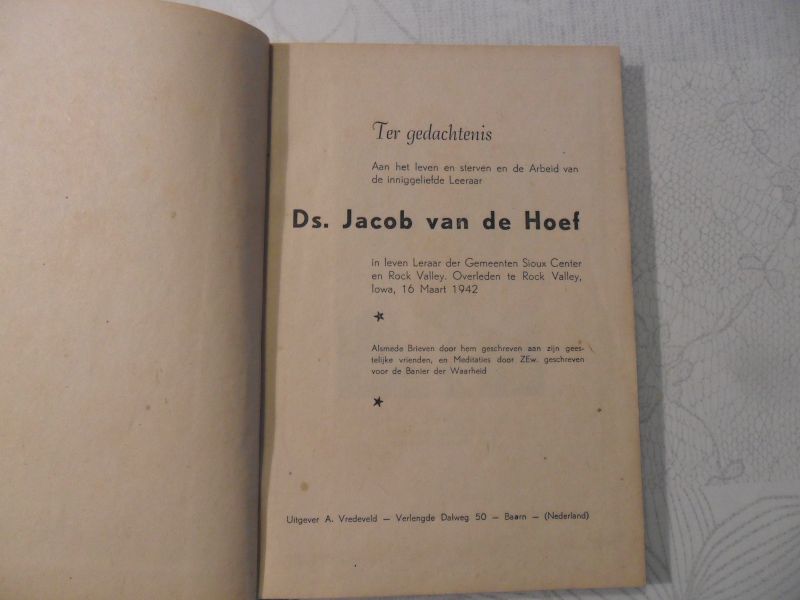 Ter gedachtenis aan het leven en sterven en de Arbeid van de inniggeliefde Leeraar Ds. Jacob van de Hoef in leven Leraar der Gemeenten Sioux Center en Rock Valley. Overleden te Rock Valley, Iowa, 16 Maart 1942