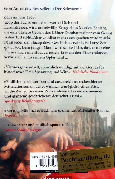 (Goldman Verlag) 19e druk 2003 507 pp paperback (leessporen op de rug, verder zgan) Staat van het boek: 8.5 Köln im Jahr 1260. Durch die Gebeine der Heiligen Drei Könige, die der Erzbischof Rainald von Dassel als Kriegsbeute mitgebracht hat, hat sich in die einstmals kleine Stadt zu einem der größten Pilgerorte der Christenheit entwickelt -- einen Pilgerort zudem, den mit dem Dom eine (wenn auch unfertige) Kathedrale krönt. Aber nicht nur Gläubige zieht das fromme Treiben an, sondern auch Verbrecher, Strolche oder Mörder. Darunter sind eher liebenswerte Streuner wie Jacob, der aufgrund seiner roten Haare „der Fuchs“ genannt wird, aber auch wahrhaft diabolische Gestalten wie der Schatten, den Reisende schon einmal gern mit dem Leibhaftigen oder einem Wolf verwechseln. Die Wege von Fuchs und Wolf kreuzen sich, was Jacob zum Verhängnis zu werden droht. Denn ausgerechnet er beobachtet, wie jemand den Dombaumeister vom Gerüst stürzt -- und verrät sich selbst dadurch, dass im selben Moment der Ast jenes Baumes bricht, auf den Jacob zum Apfelstehlen gestiegen war. Von nun an muss Jacob um sein Leben fürchten, und nicht nur das: Jeder, mit dem er spricht, stirbt eines unnatürlichen Todes Prijs €4,50 |