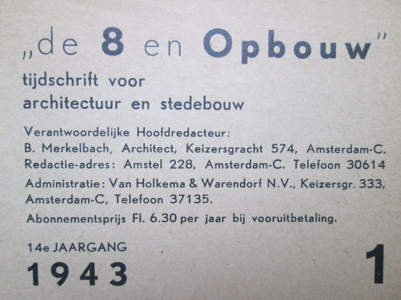 Linnen band vertoont wat verkleuring en roestpuntjes. Inhoud: 1940: nr 2, 4, 5, 6, 7/8, 9, 10, nummer?(blz 155 t/m 184), 20/21 1941 nr.1, 4, 5, 6, 7, 11, 12 1942 nr.1, 2, 4, 6, 9, 11 1943 nr.1 Tekeningen/afbeeldingen van ontwerpen/projekten van o.a. Merkelbach, Karsten, van Loghem, Bodon, La Croix, Boeken, Holt, Kloos, Staal, Stam, Stam-Beese, van Tijen, Maaskant, Zanstra, Giesen, Sijmons, Duintjer, Komter, Margry, Limperg, Rietveld, Donk, Schuitema,, van Woerden, van Ravensteyn, Brusse, Asplund, Bakema, Stapper, Koggink, Meyer, Moser en Schipper. |