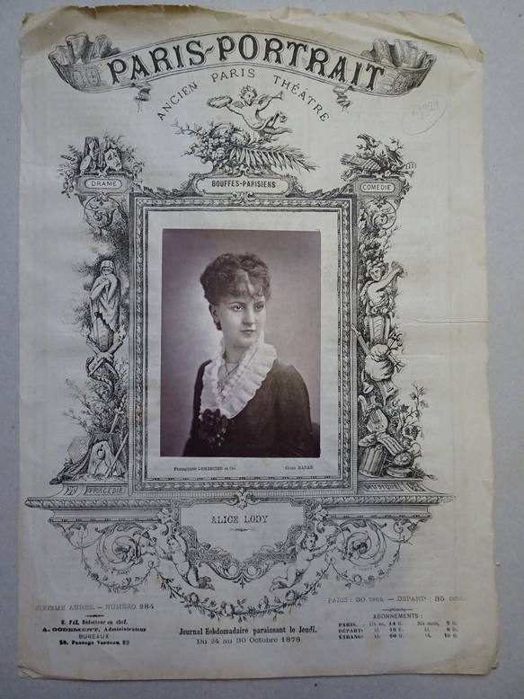| Bijzonderheden: | 1878; plano, cover of Paris-Portrait with mounted photo-lithograph of Alice Lody; photoglyptie by Lemercier et Cie, cliché by Nadar; 6th year, no. 284 |