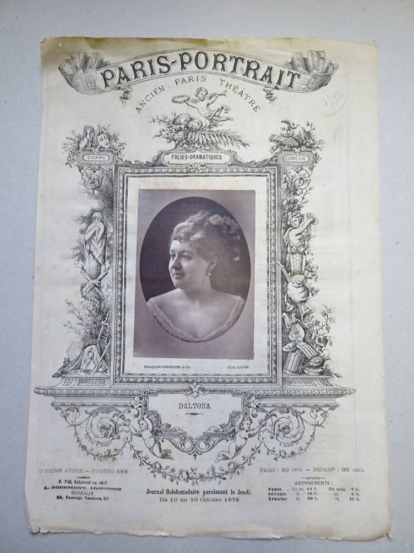 | Bijzonderheden: | 1878; plano, cover of Paris-Portrait with mounted photo-lithograph of Daltona; photoglyptie by Lemercier et Cie, cliché by Nadar; 6th year, no. 282. |
