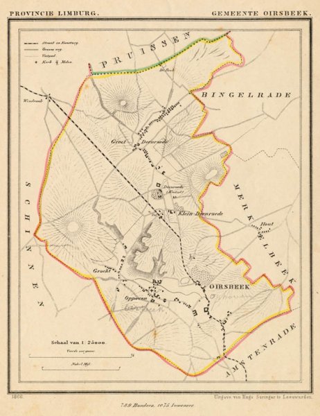Originele lithografie uit de gemeenteatlas van de provincie Limburg. Met de hand ingekleurde gemeentegrenzen. |