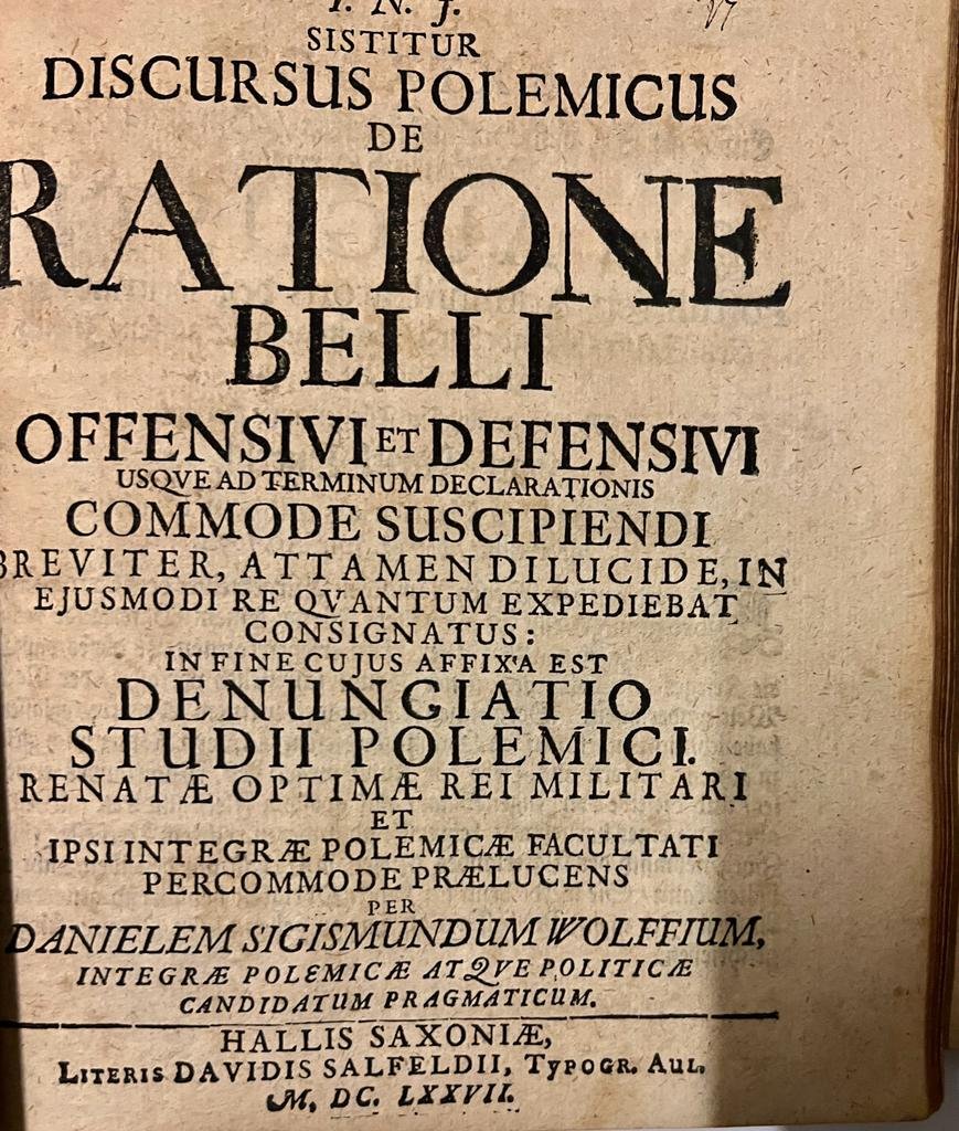 | Titel: | Dissertation 1677 I Discursus polemicus de ratione belli offensivi et defensivi (...) Halle David Salfeld 1677. |