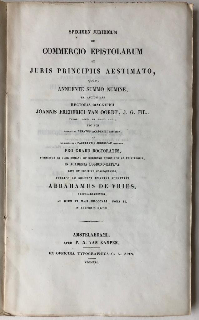 | Titel: | Specimen jruidicum de commercio epistolarum ex juris principiis aestimato [...] Amsterdam P.N. van Kampen 1841 |