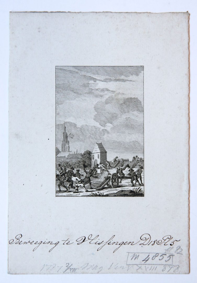| Titel: | Prent: 'Beweeging te Vlissingen' [d.d. 2-7-1787], gravure door R. Vinkeles naar J. Buys. |