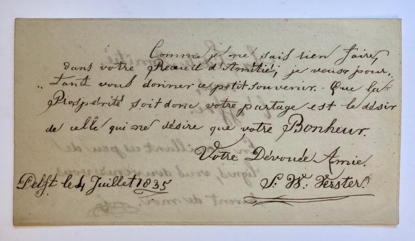 | Bijzonderheden: | Blaadje uit een album amicorum, dd. Delft 1835, ondertekend S.W. Verster. |