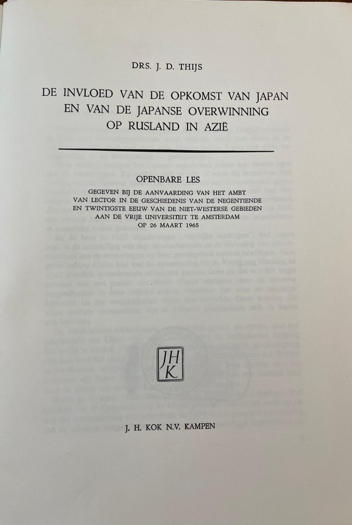 | Titel: | Oratie VU J.D. Thijs 1965 | De invloed van de opkomst van Japan en van de Japanse overwinning op Rusland in Azië. [...] Kampen J.H. Kok 1965 |