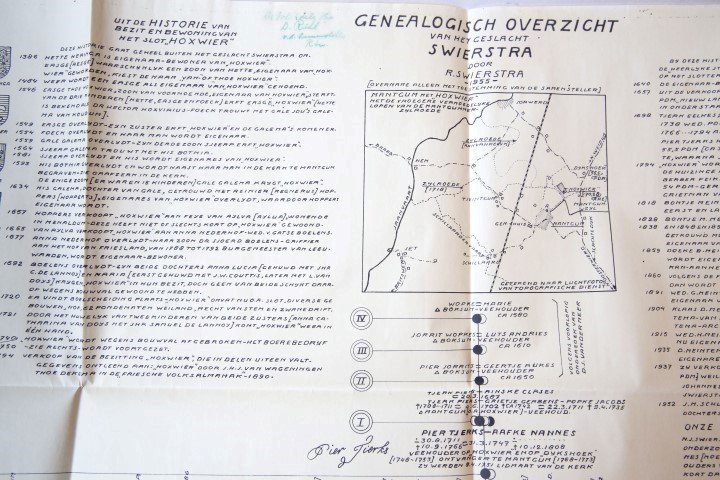 | Bijzonderheden: | Genealogisch overzicht van het geslacht Swierstra, door R. Swierstra te Santpoort, 1955, Blad A. Groot blad (50x100 cm), lichtdruk. Met familiewapens, afb. Hoxwier en plattegrond van Mantgum. Fraai blad. |