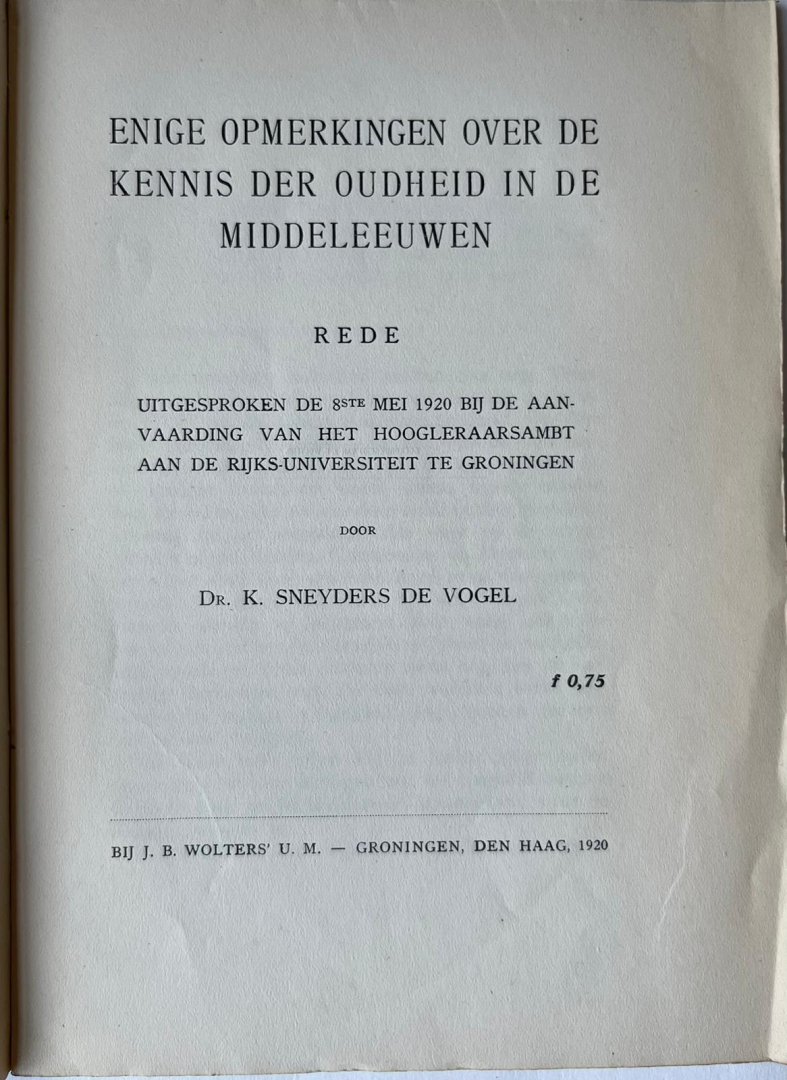 | Titel: | Enige opmerkingen over de kennis der oudheid in de Middeleeuwen. Groningen J.B. Wolters 1920 |