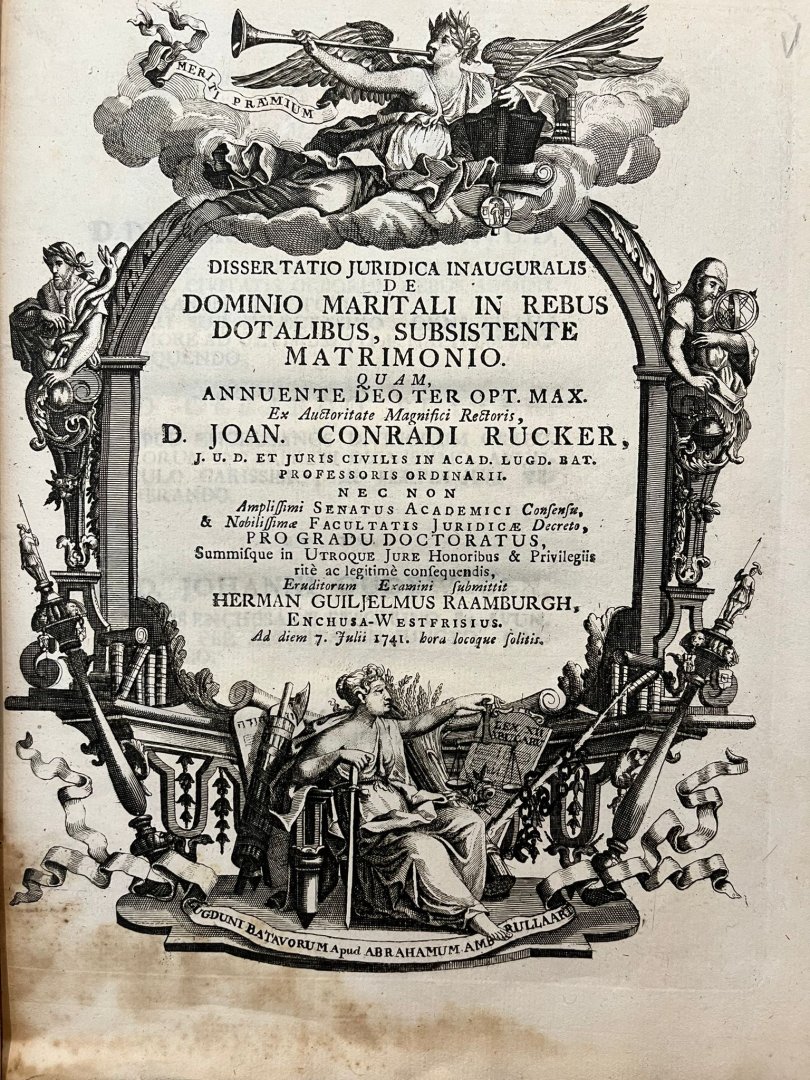 | Titel: | Dissertation legal 1741 | Dissertatio juridica inauguralis de dominio maritali in rebus dotalibus, subsistente matrimonio [...] Leiden Abraham Ambrullaart 1741 |