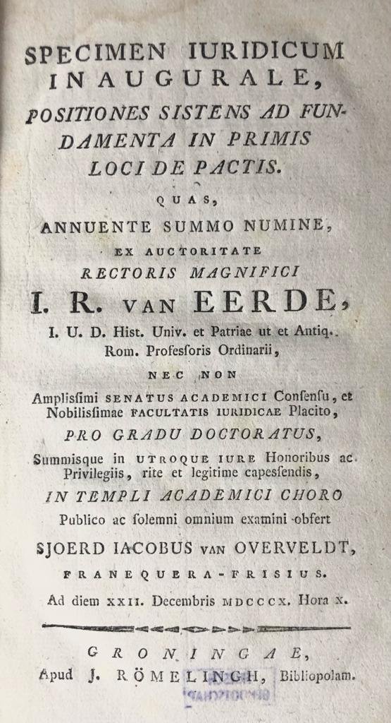 | Titel: | Specimen iuridicum inaugurale, positiones sistens ad fundamenta [...] Groningen J. Römelingh 1810 |