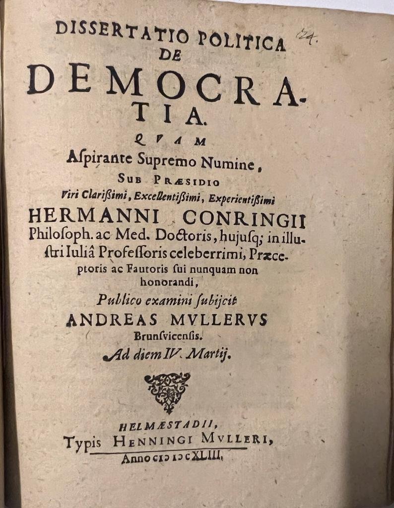 | Titel: | Dissertation 1643 I Dissertatio politica de democratia [...] Helmstedt Henning Müller 1643. |