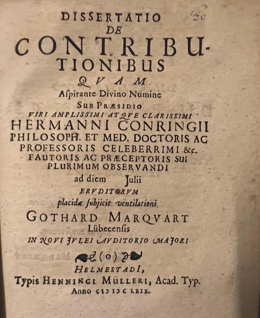 | Titel: | Dissertation 1669 I Dissertatio de contributionibus [...] Helmstedt Henning Müller 1669. |