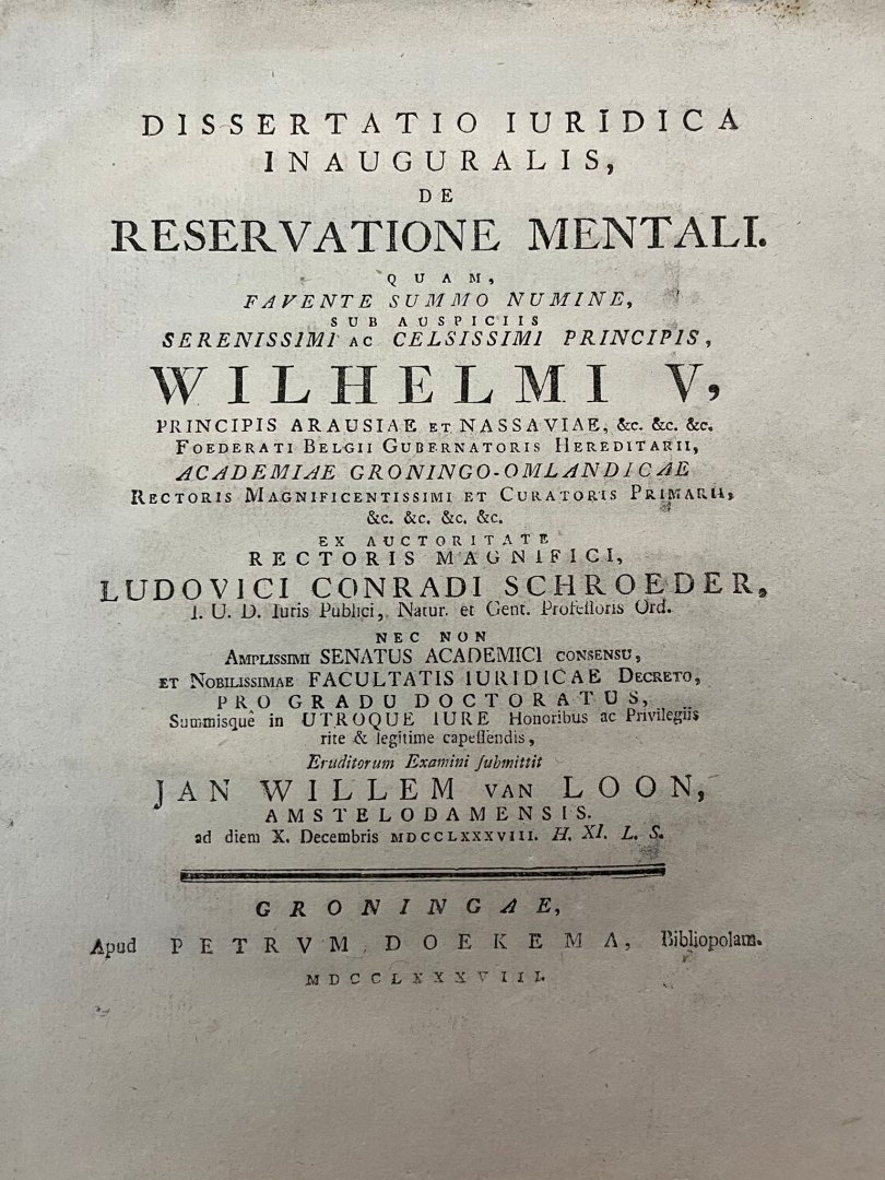| Titel: | Dissertation legal 1788 | Dissertatio iuridica inauguralis, de reservatione mentali [...] Groningen Petrus Doekema 1788 |
