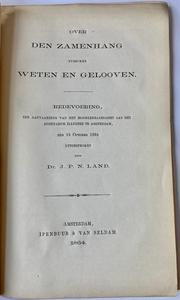 Land, J.P.N. - Over den zamenhang tusschen weten en gelooven. A