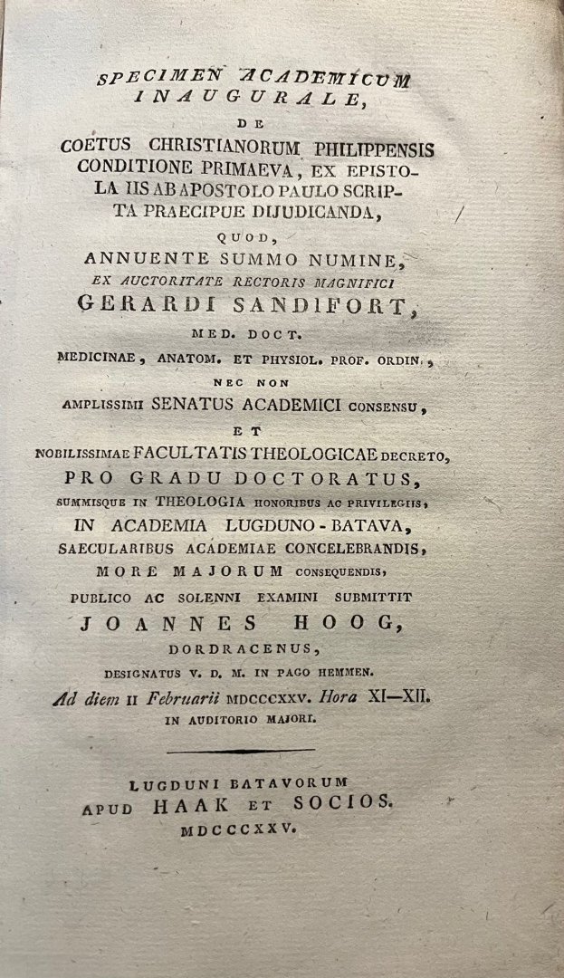| Titel: | Dissertation theology Leiden Hoog 1835 | Specimen academicum inaugurale, de coetus christianorum philippensis conditione primaeva, ex epistola iis ab apostolo Paulo scripta praecipue dijudicanda [...] Leiden Haak en Comp 1835 |
