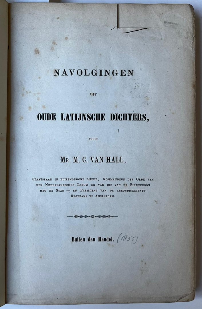 | Meer info: | Gezien de geringe waardering voor de klassieke dichters heeft hij besloten de bundel niet algemeen verkrijgbaar te stellen, zo schrijft de 87-jarige Van Hall in het door hem eigenhandig ondertekende voorwoord. Het jaar daarop zou hij afscheid nemen als rechtbankpresident in Amsterdam. L0201. |