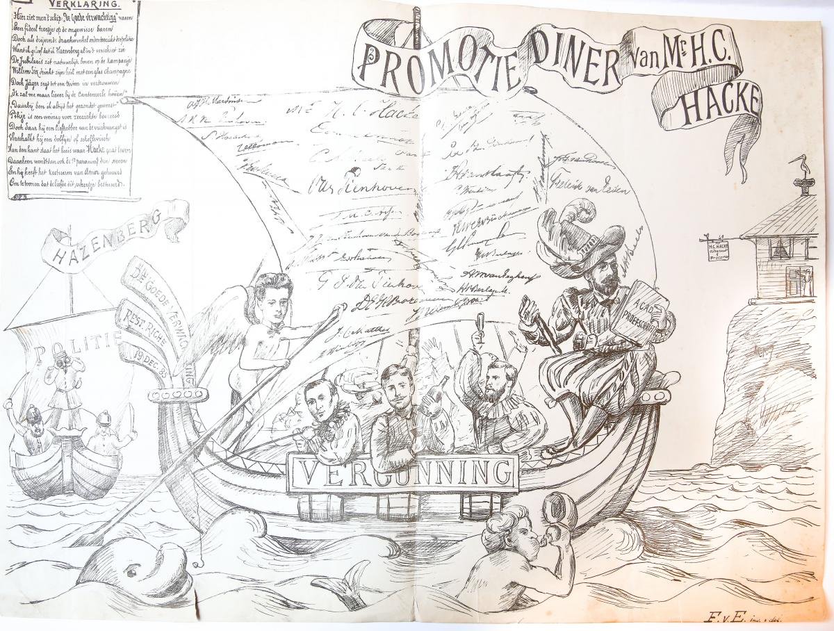 Handtekeningen van de promovendus, de paranimfen Ernst van Lennep en C.A. Beels en voorts van o.a.: van Tienhoven, Hoekstra, Asser, Matthes, Hinlopen, van Eeghen, Buckmann, van Rossem, Frederik van Eeden, van Lennep, Beels, etc. Op de boeg: De goede Verwachting en Rest. Riche. Op de politieboot Hazenberg. In de vissersboot de koppen van Hacke, Willem Six, Junger, en Pikje.