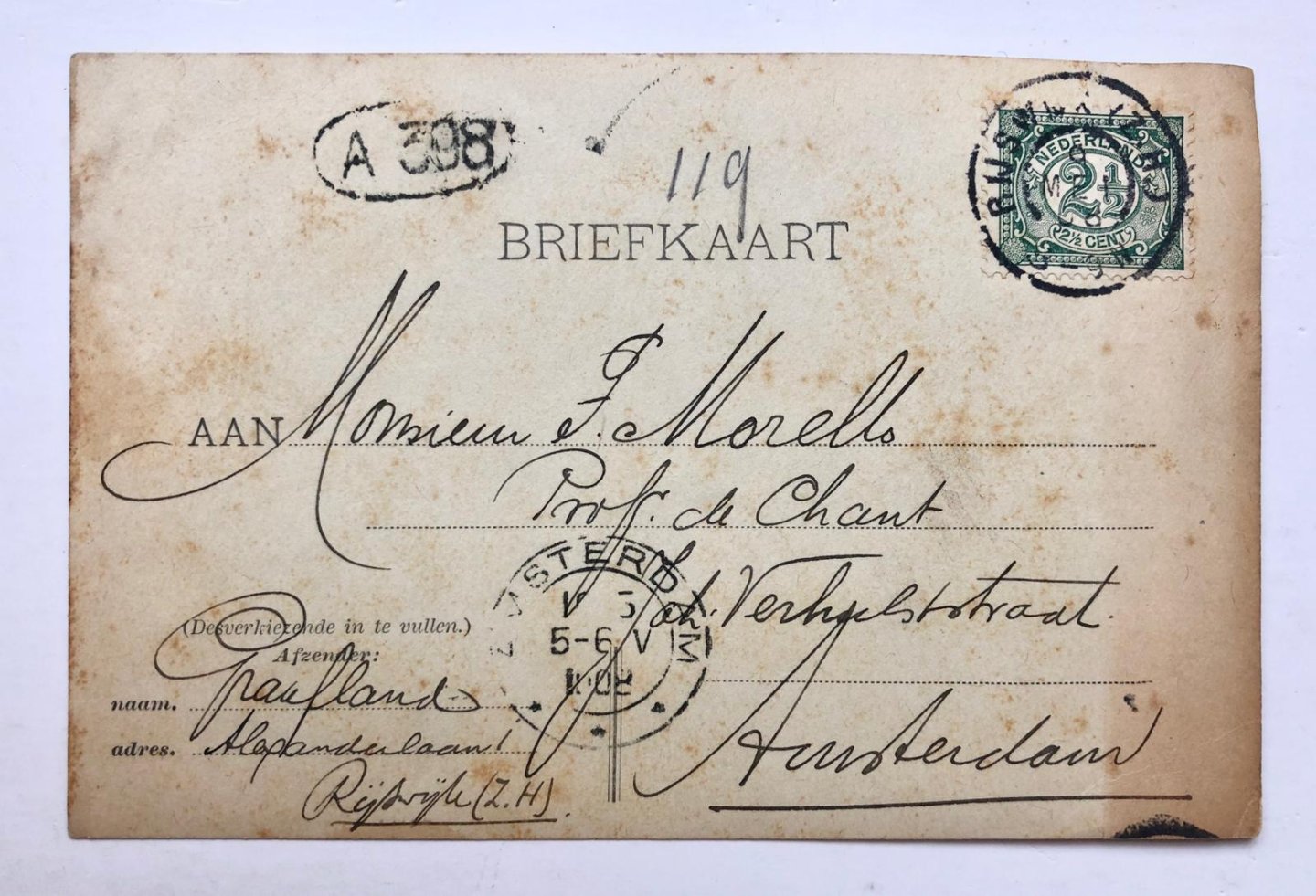 | Titel: | [Postcard 1908] Briefkaart van ... Graafland, d.d. Rijswijk 1908, aan de zangpedagoog Morello te Amsterdam. Manuscript. |