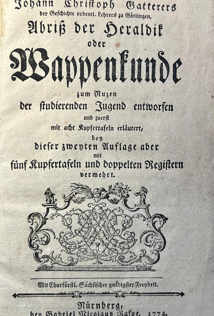 ![Gatterer, J.C. - Heraldry 1774 | Abriss der Heraldik oder Wappenkunde (...) zweyten Auflage (second edition), Nurnberg Gabriel Nicolaus Raspe 1774, [8]+128 pp. Illustrated with 13 sheets with engraved coat of arms. Gatterer, J.C. - Heraldry 1774 | Abriss der Heraldik oder Wappenkunde (...) zweyten Auflage (second edition), Nurnberg Gabriel Nicolaus Raspe 1774, [8]+128 pp. Illustrated with 13 sheets with engraved coat of arms.](https://images.boekwinkeltjes.nl/medium/5Pe935fGWC7J3cVRHa8l.jpeg)