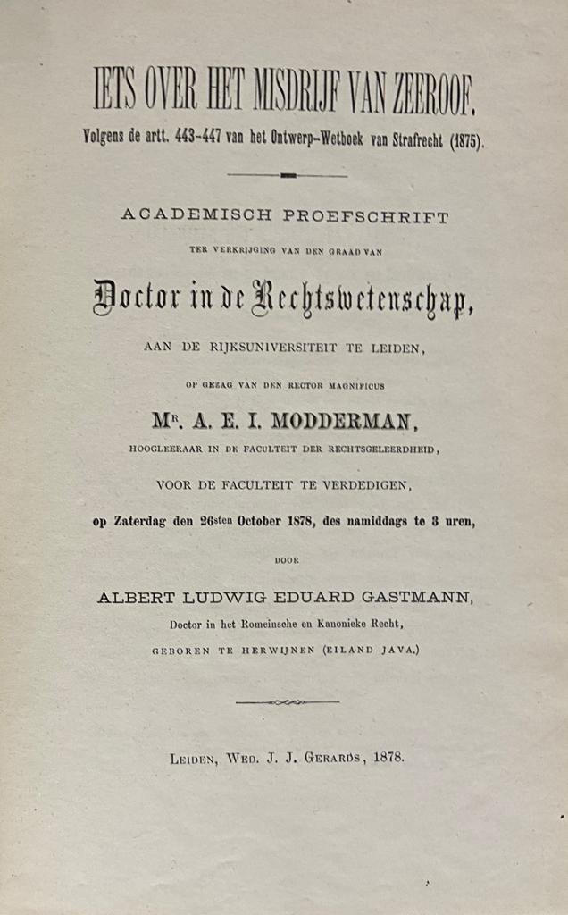 ![Gastmann, A.L.E. - [Dissertation 1878] Iets over het misdrijf van zeeroof. Volgens art. 443-447 van het ontwerp Wetboek van Strafrecht (1875). Leiden, 1878. Gastmann, A.L.E. - [Dissertation 1878] Iets over het misdrijf van zeeroof. Volgens art. 443-447 van het ontwerp Wetboek van Strafrecht (1875). Leiden, 1878.](https://images.boekwinkeltjes.nl/medium/g1jZclq2QqE1YFBIBrdC.jpeg)