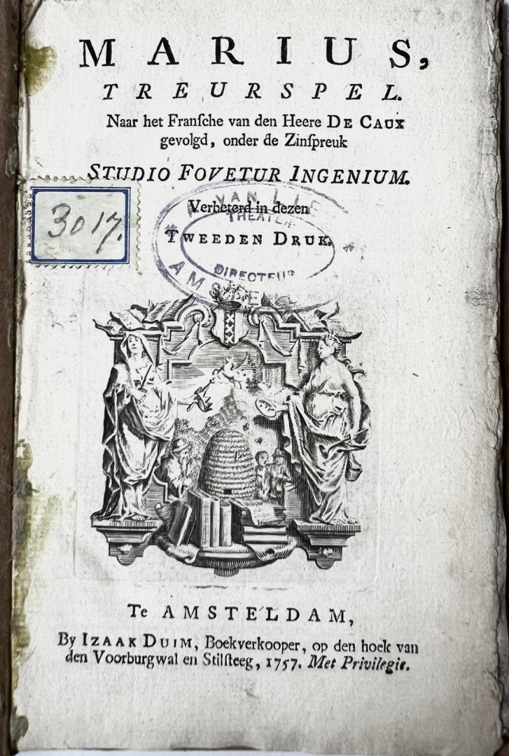 | Titel: | Theatre play 1757 | Marius, treurspel. Vertaald uit het Frans onder de zinspreuk Studio Fovetur Ingenium. 2e druk. Amsterdam, Izaak Duim, 1757. |